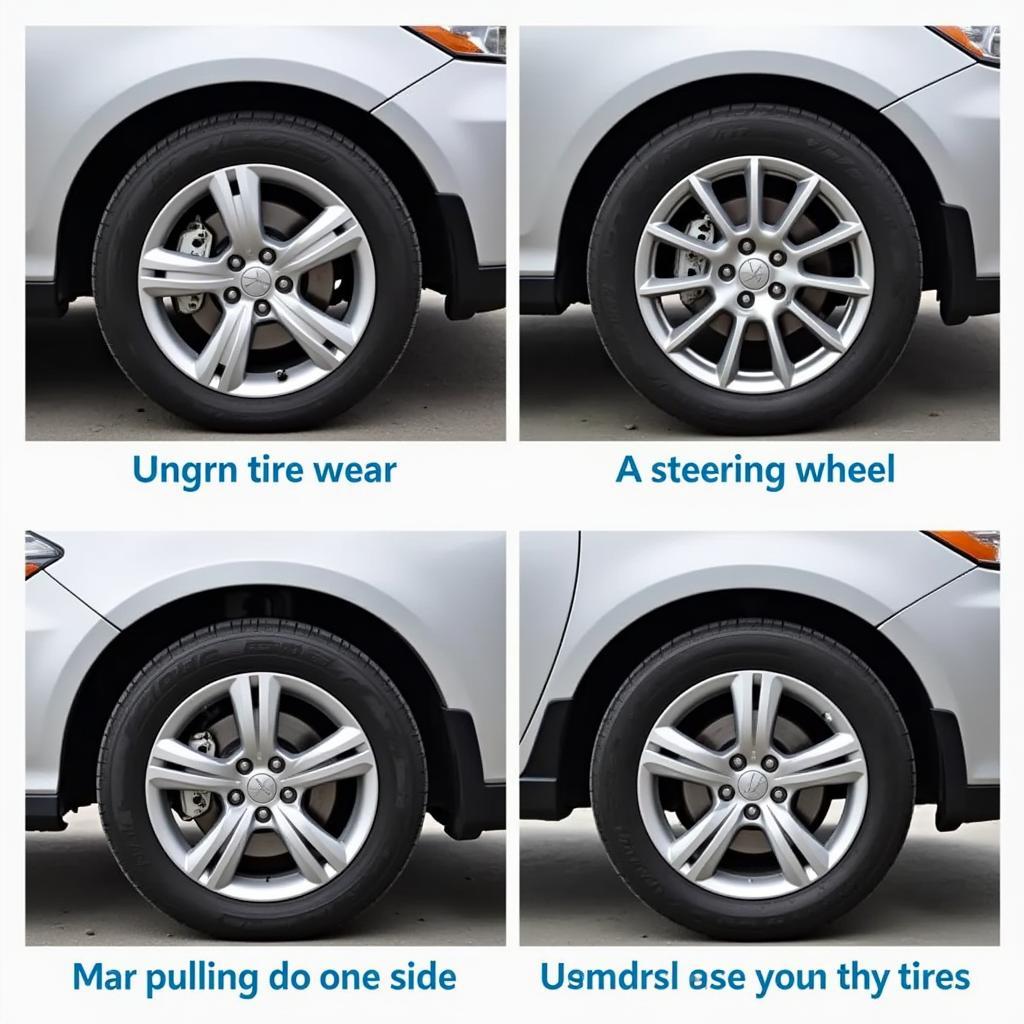 Dấu hiệu mất cân bằng lốp xe ô tô: Lốp mòn không đều, vô lăng rung lắc, xe bị lệch lái, có tiếng ồn bất thường.