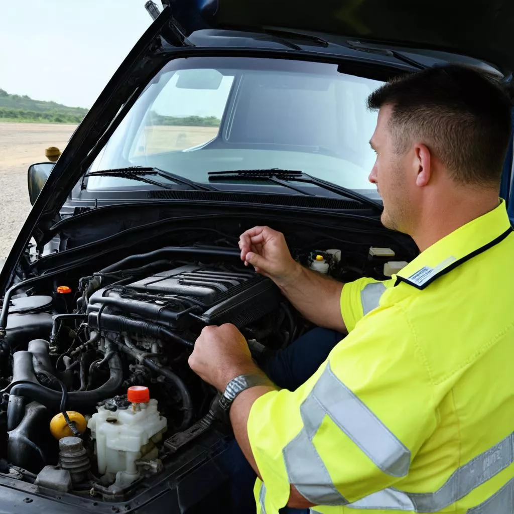 Tài xế xe tải đang kiểm tra động cơ