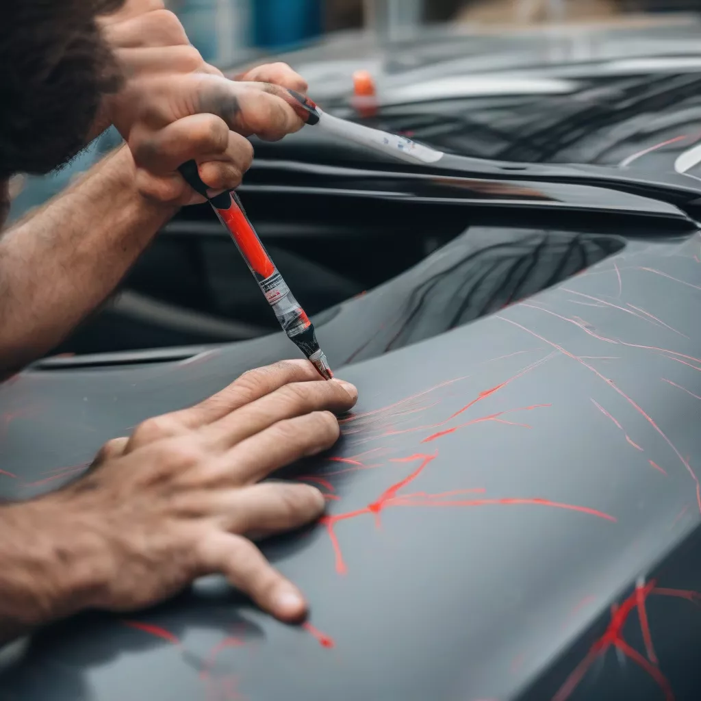Mann benutzt einen Lackstift, um einen Kratzer am Auto zu überdecken