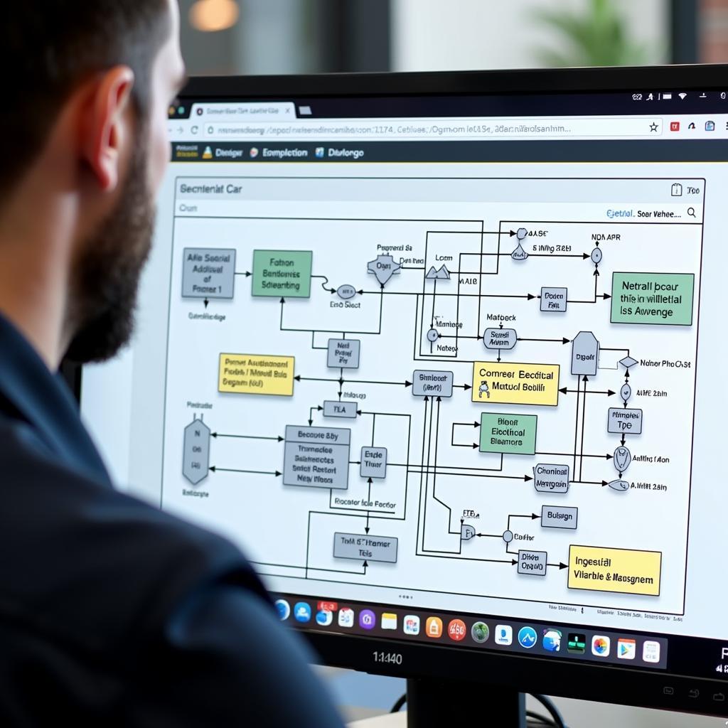Học điện ô tô online: Sơ đồ hệ thống điện ô tô phức tạp được hiển thị trên máy tính.Học điện ô tô online: Sơ đồ hệ thống điện ô tô phức tạp được hiển thị trên máy tính.