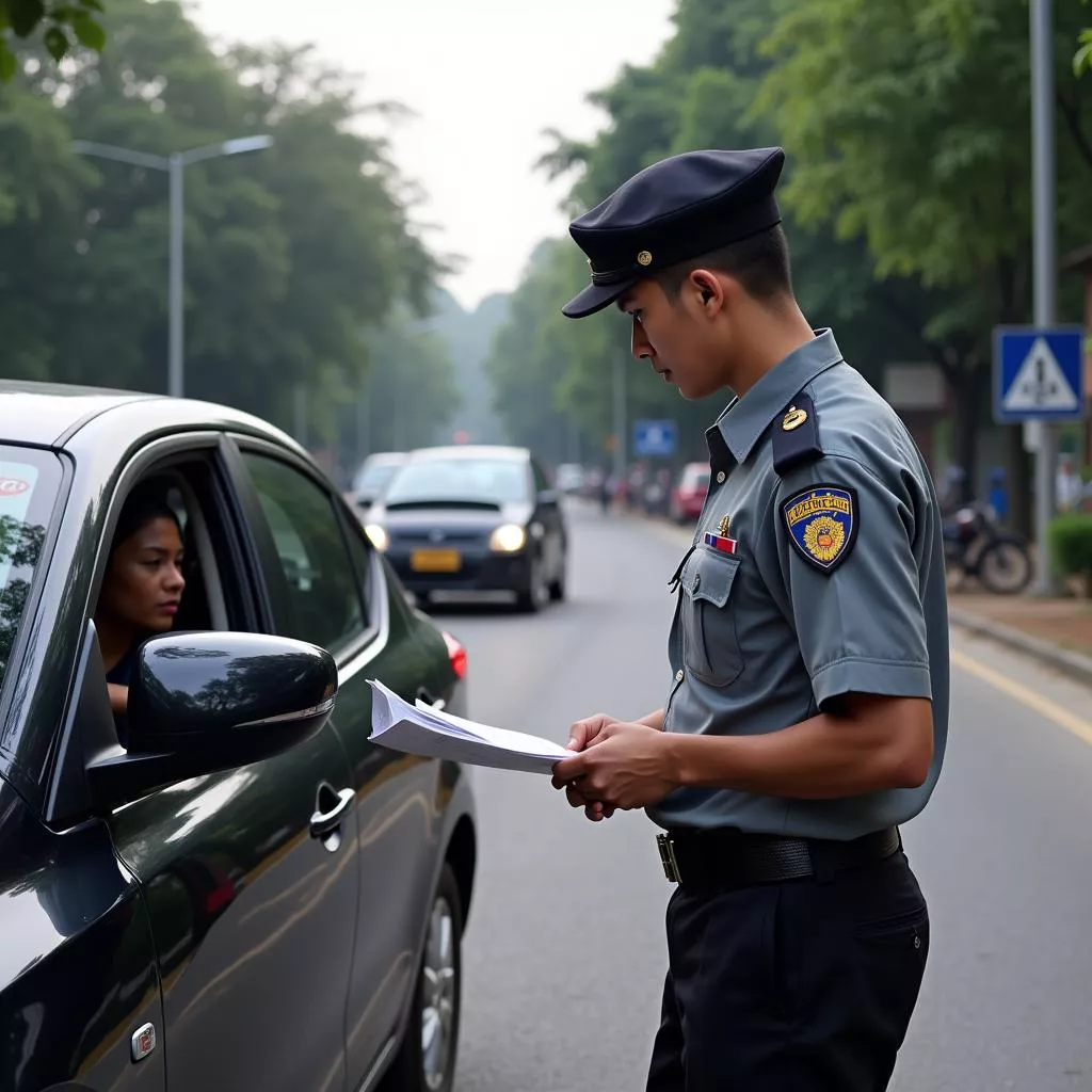 Petugas polisi lalu lintas memeriksa surat-surat kendaraan
