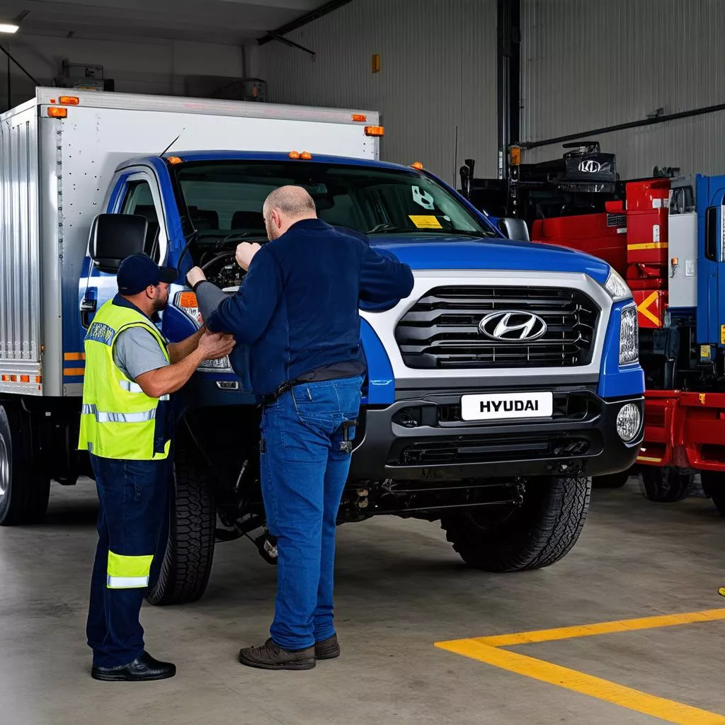 ドライバーがHyundaiトラックを点検しているドライバーがHyundaiトラックを点検している様子